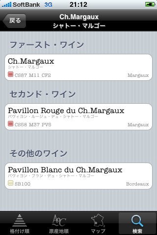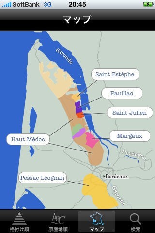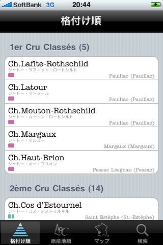 App Storeより引用ボルドーはワインファン憧れの地です。ラフィット、ラトゥール、ムートン、マルゴー、オーブリオンといったシャトーは、「五大シャトー」として名実ともに、世界中の人々を魅了してきました。このアプリケーションは、これらのシャトーを含む、1855年に格付けされた1級から5級までの61シャトーの情報をまとめたレファレンスです。