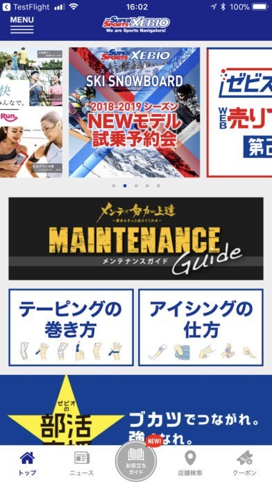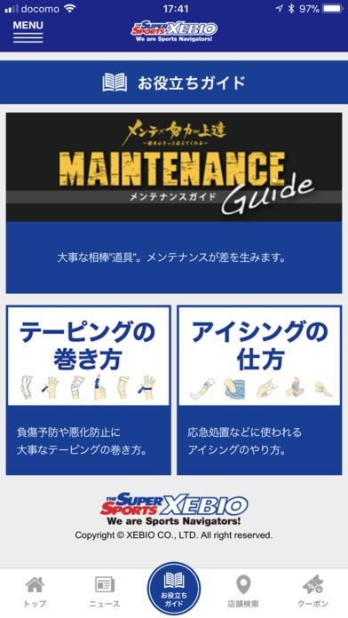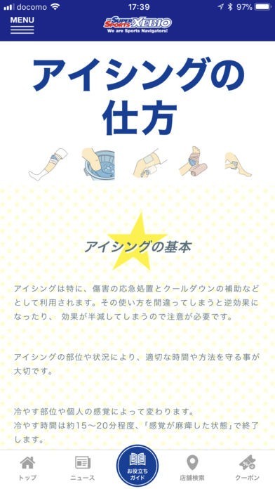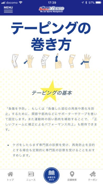 スーパースポーツゼビオアプリでは、スポーツ用品の購入やメンテナンスにかかわる情報だけでなく、テーピングやアイシングの仕方などが掲載されており、スポーツの最中にも役立つものとなっています。
