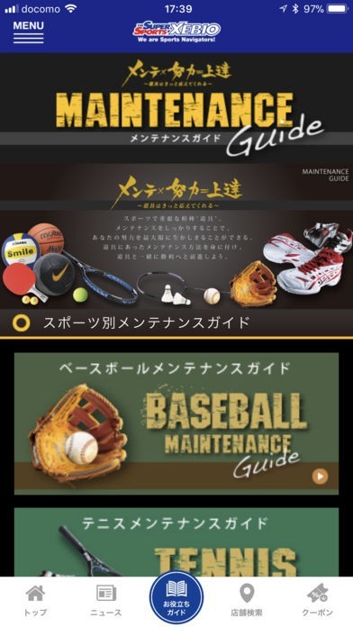スーパースポーツゼビオアプリでは、店舗情報やクーポン情報以外に、野球やテニス用品など、様々なスポーツ用品のメンテナンスの仕方が掲載されており、スポーツ用品をより長く使える手助けとなります