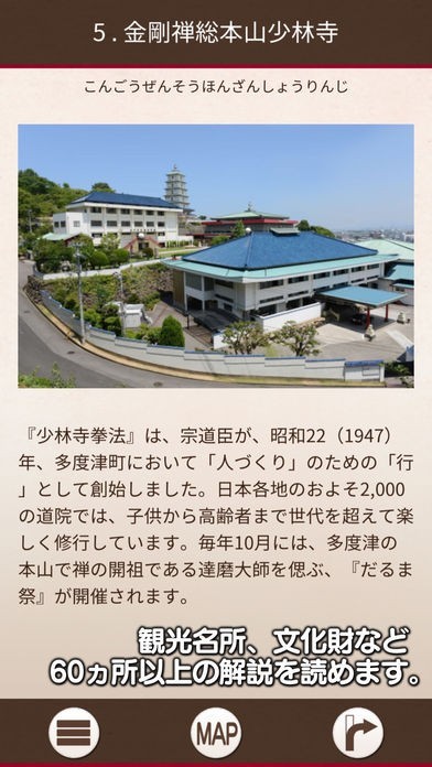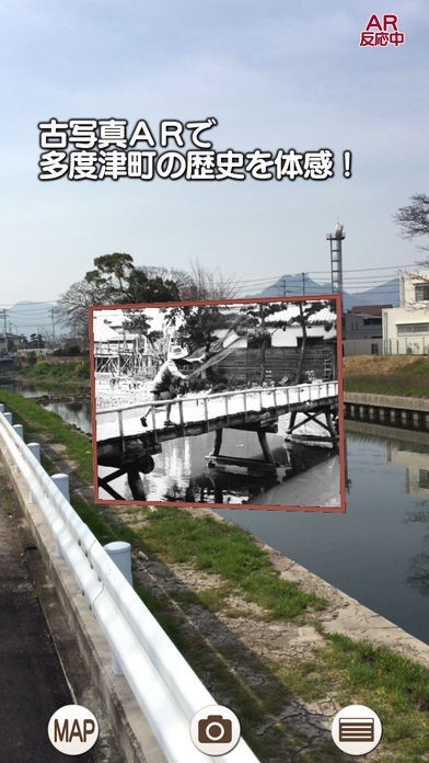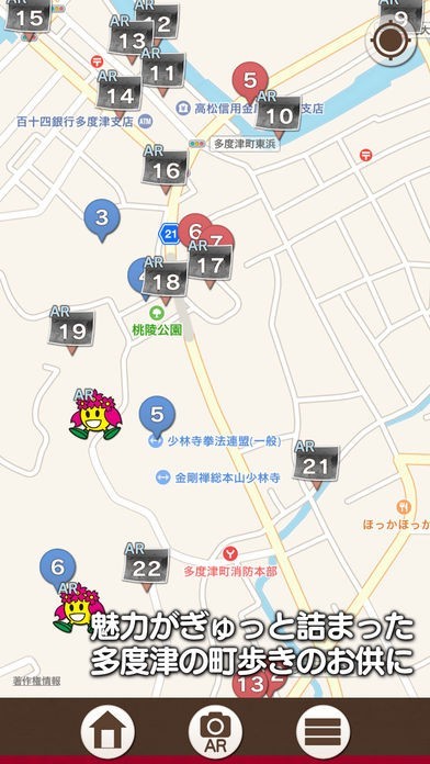 App Storeより引用「多度津ナビ」は、香川県多度津町内の多数の観光スポット、文化財の情報がわかり、楽しく町歩きをすることができるアプリケーションです。第77番札所道隆寺や8620形蒸気機関車など、40ヵ所以上の観光スポット、文化財の情報を得ることができます。また、在りし日の桜川周辺の光景や琴平参宮電鉄の様子などが写った20枚以上の古写真が現地でARで出現し、多度津の歴史町歩きを楽しむことができます。多度津町マスコットキャラクター「さくらちゃん」と一緒にAR記念撮影をすることもできます。ぜひ、「多度津ナビ」をダウンロードして多度津の町歩きを楽しんでみてください。