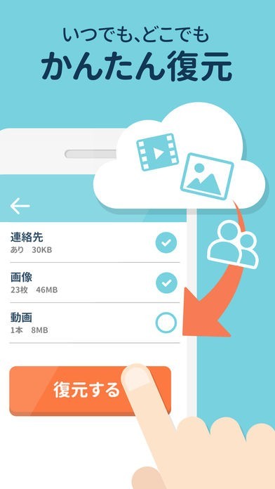 「Yahoo!かんたんバックアップ」では外部のクラウドへデータを保存させる、保存させたデータを復元させることが可能です。 貯まった写真や動画などのデータを保存し、スマホの容量を節約したい時に便利です。 自動バックアップ機能により、スマホ内に追加されたデータは自動的に外部に保存されます。 外部に保存させておけば、うっかりスマホを水没させてしまい、大切なデータを失ってしまうという心配も無くなります。 連絡先のデータも保存できるため、新しいスマホに買い替えた時にも役立ちます。