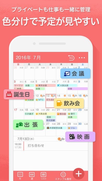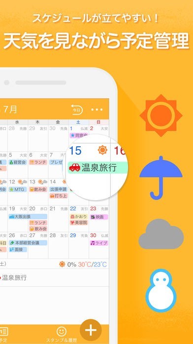 メリット:カレンダーを予定ごとに色分けして見やすく出来たり、天気情報ごとの予定を組む事が可能です。また、予定変更も簡単な操作で行えるところは大変便利です。