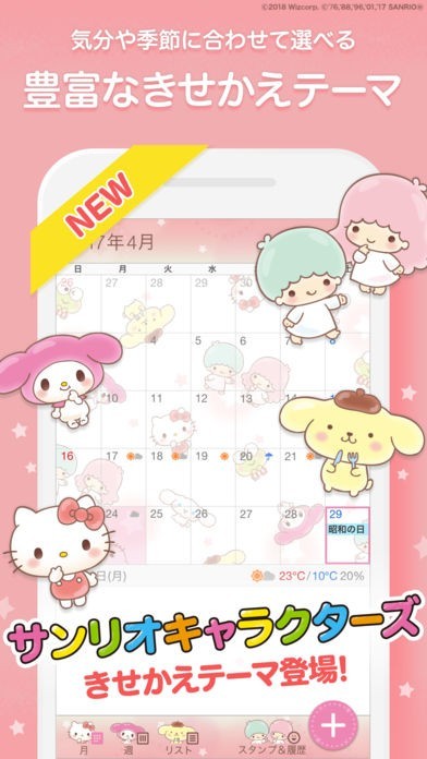 Yahoo!サービスは着せ替えテーマが充実しており、このカレンダーアプリではキティやポムポムプリンなどに変えられるので、めっちゃかわいいカレンダーを使えてテンションが上がります!