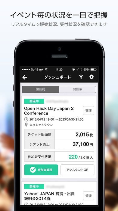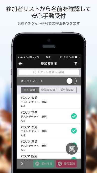 内臓カメラを使ったQRコード読み取り受付と、参加者リストからのお名前選択受付を、