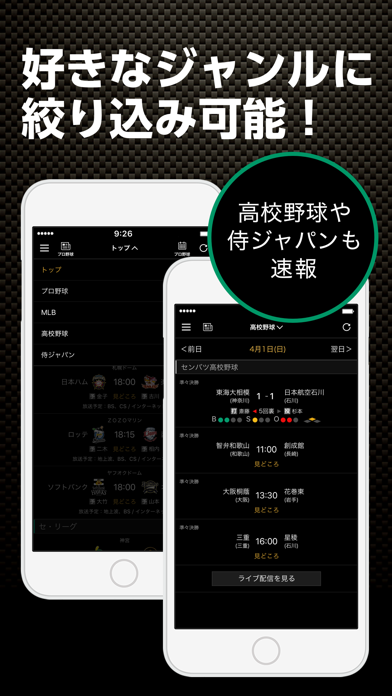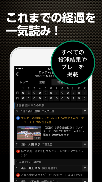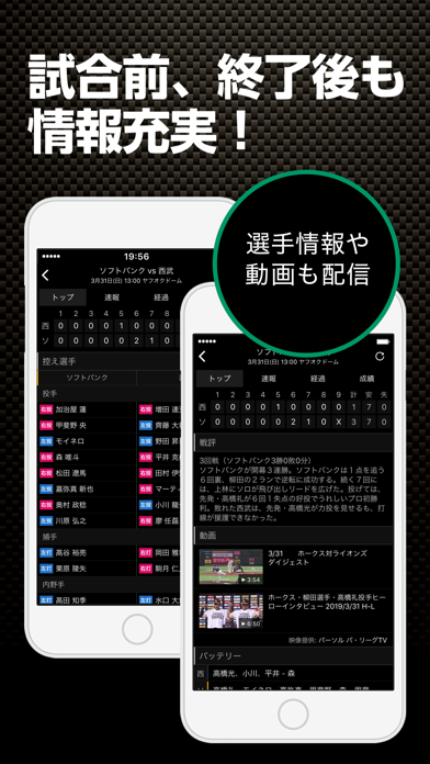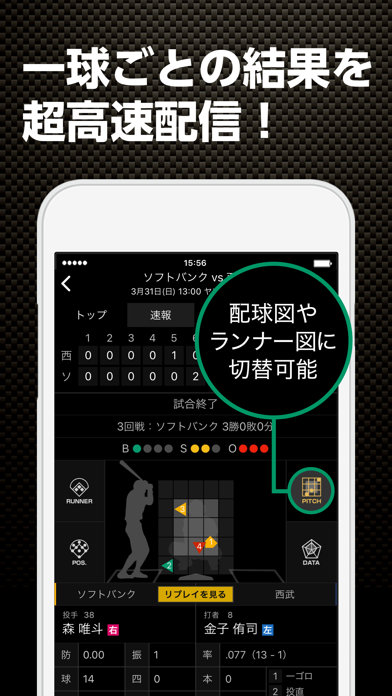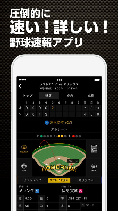更新速度が圧倒的に速く、一球ごとの結果を超高速で配信。実際の試合からほとんどリアルタイムで表示されるので従来の速報のように更新ボタンを押す必要がない。配給チャートをはじめ、ランナー状況やポジションマップなどのビジュアル情報を搭載。選手名をタップすると詳しい選手情報を表示。また選手データも見ることができ、現在の投手と打者の対戦成績や、左右別、チーム別など現在の状況に応じた各種成績がわかる。その他、試合中断時の詳しい状況や記録達成などの補足情報も随時発信。