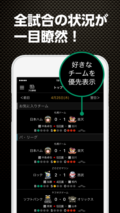プロ野球の結果が一覧でスピーディにわかる上、一球ごとの文章解説で詳しく試合を振り返ることもできます。