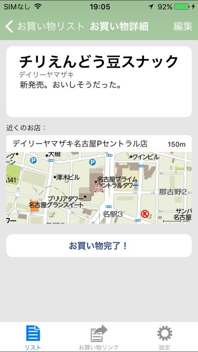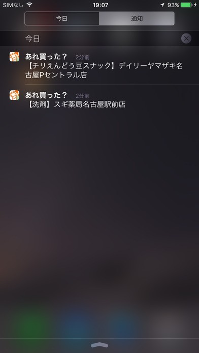 「買いたいもの」と「お店の種類(コンビニ、スーパーなど)」を登録しておくと、お店の近くに来た時に「あれ買った?」とリマインドしてくれます。
