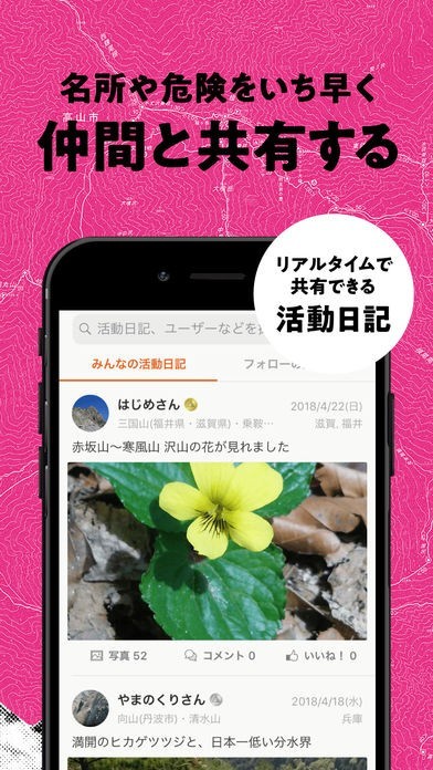 登山ルートや写真を日記として記録し、ユーザー同士で共有することができる。