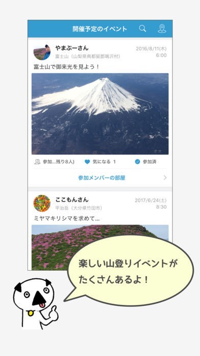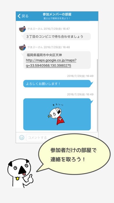 実際に山登りイベントの企画が始まったら参加者とはチャットを使ってやり取りが行えます。事前準備に何が必要かを話し合ったり、イベント前に仲良くなるために便利な機能です。