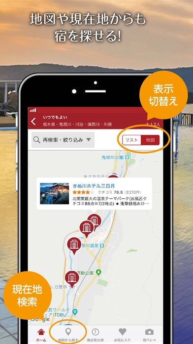 日本全国の温泉宿を探し出し、予約することができるアプリ