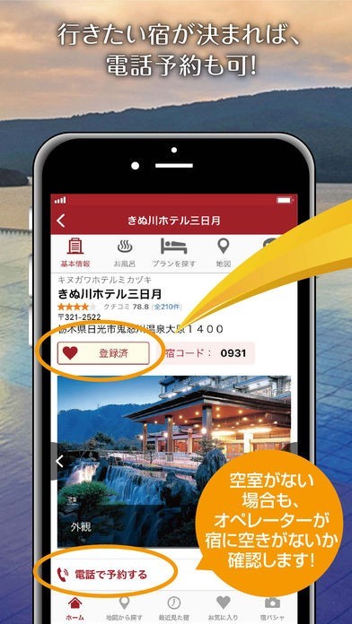 温泉宿を条件を入力して探し出し、気に入った場所を見つけたらアプリ上で宿泊予約することができる便利なアプリです。料金や地図、宿の詳細な情報を得ることができるので安心して予約できます。