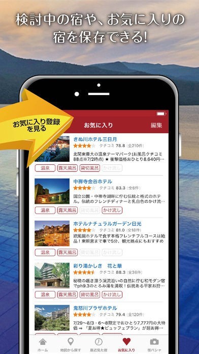 気になった温泉宿はお気に入り登録をすれば、後程ゆっくり見直せる