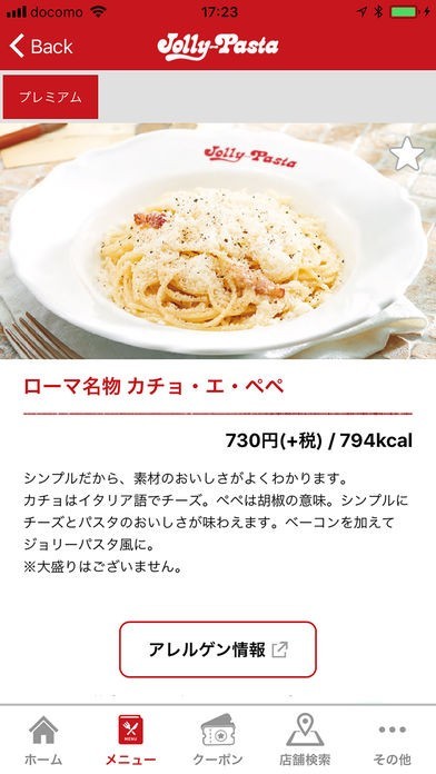 フリーワードや住所から周辺にあるジョリーパスタの店舗を検索でき、近くの店舗のお得意情報等をゲットできるかもしれません。またメニュー一つ一つにはカロリーが表示されているので、カロリーに気遣っている人にはチェックしやすいアプリになっています。