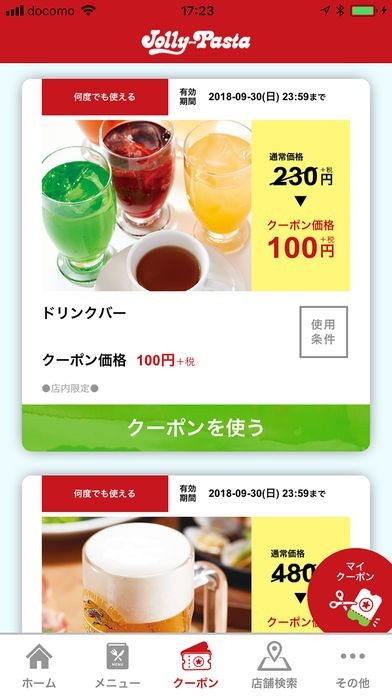 クーポンが豊富なのでジョリーパスタに行くたびに使用してます。お得にお食事出来て嬉しいです。