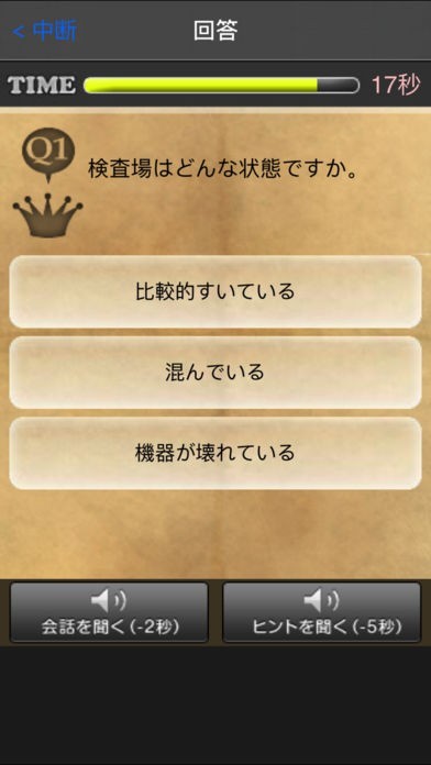 このアプリではどうしてもわからない時にはヒント機能が用意されています。もう一度聞くボタンもあり聞き逃したときも安心です。ヒントでは会話の重要な部分だけを再生してくれます。この部分から会話全体の雰囲気を読み取り、クイズに正解していきましょう。