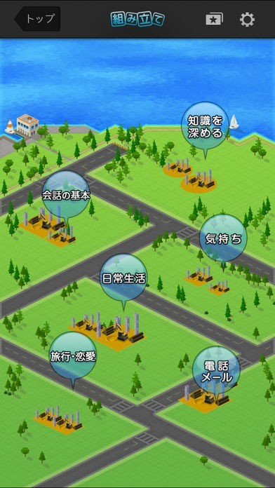 和文を英文に変換する度に、街が賑わいビルが立ち並んでいきます。進行状況が一目でわかるので、英語が苦手な人も楽しみながら学習することができます。英文は単語を順番にタップして行くだけなので、英語が苦手な人もゲーム感覚で日常会話の英文の構成が学べ、ネイティブの発音も確認できるので英会話にも役立ちます。