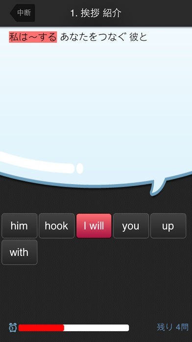 設定には時間制限モードが搭載されているので、日本語から英文への変換スピードを鍛えることができます。解答画面の下にはタイムバーが表示され、時間の進行状況が一目でわかります。時間内に解答するスピード力を鍛えられるので、実際の英会話にも役立つ英語の組み立ての瞬発性が鍛えられます。