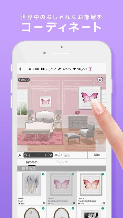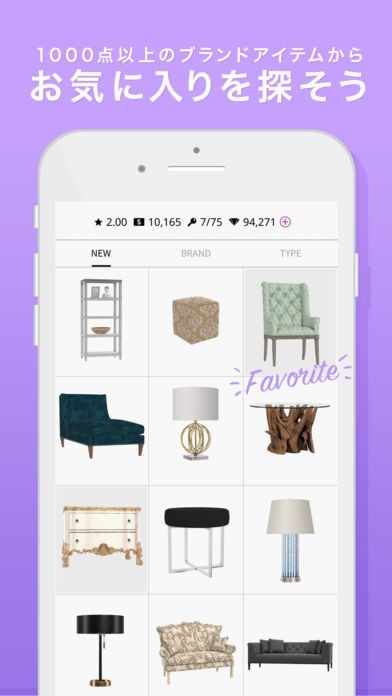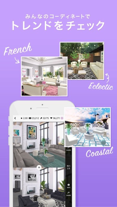 2,000種類以上の家具やインテリアが用意されていて、内装を自由にコーディネート出来る仕様が良いです。投票機能が搭載されていて、ユーザー同士でお気に入りの部屋が覗けるのも面白い点でした。