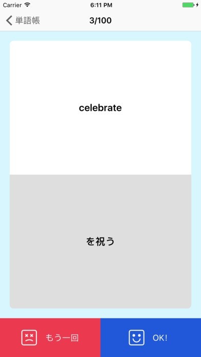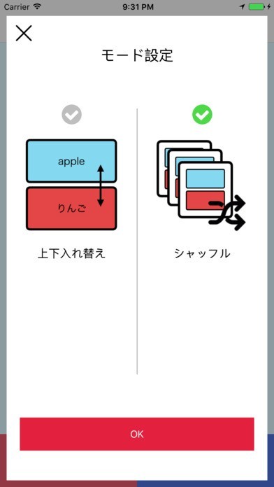 上下入れ替えモードとシャッフルモードがあるので様々な方法で暗記ができます。
