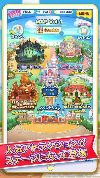 ディズニー ツムツムランドはディズニーのキャラクターをモチーフにしたかわいい「ツム」を飛ばして邪魔なツムバブルを消していくアクションパズルゲームです。ディズニーランドの人気アトラクションイッツ・ア・スモールワールドやビッグサンダーマウンテンなどがステージとなっていて、ゲーム進行によってステージが開放されていきます。ツムを手に入れて一緒に写真を撮ったり、パーク内にチュロスの店を建てることなどもできます。なお、ゲームのスコアはランキングに対応しています。