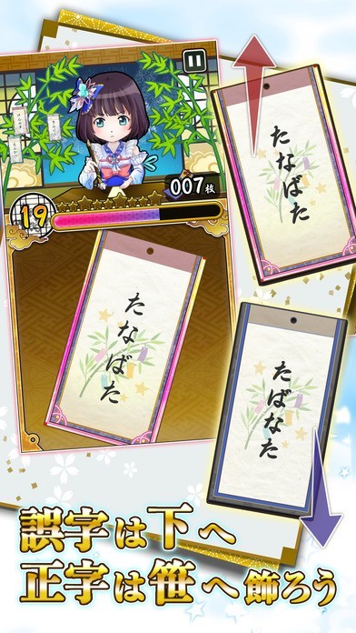 魔法使いと黒猫のウィズというクイズRPGアプリのスピンオフ。短冊に書かれている文字に誤字があるかどうかを一瞬で見極め、誤字の有無によって上下にフリックしていきます。一瞬の判断がものを言うシンプルなアプリなので、上達していくごとにどんどんスコアを伸ばしていけるでしょう。スピンオフ元の作品が好きな方は世界観が統一されているためより楽しめるよう設計されています。黒猫のウィズに慣れ親しんでいる方はもちろん、明快なルールのもとゲームを楽しみたい方もインストールしてみましょう!