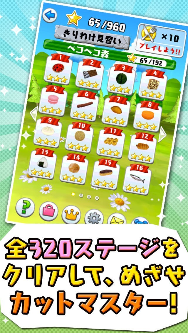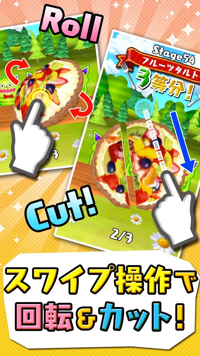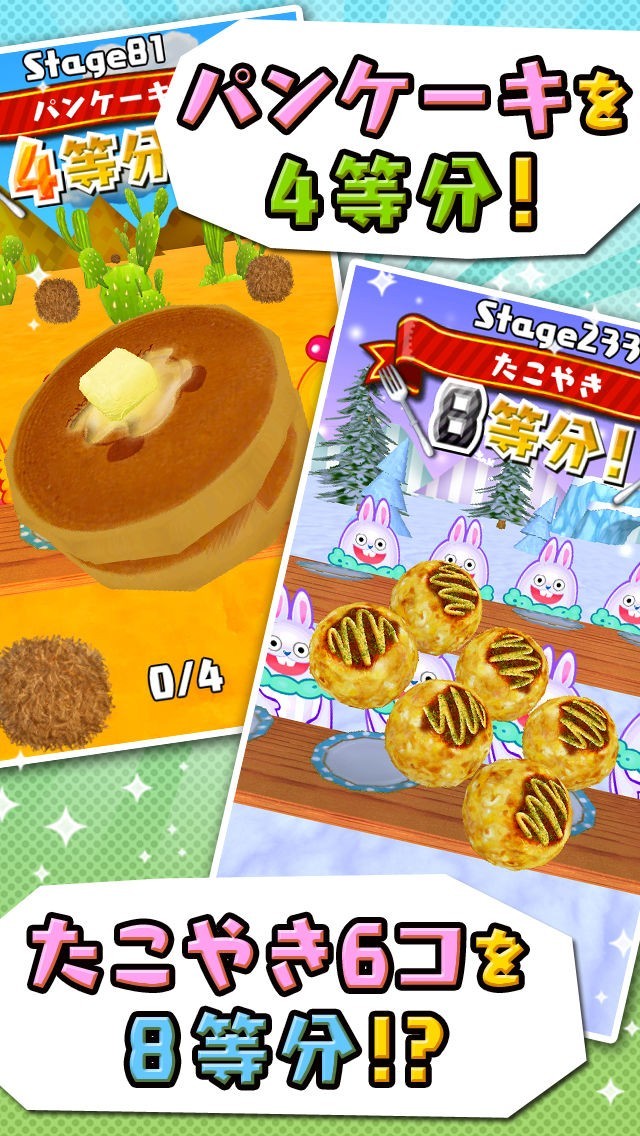 100種類以上の食べ物が登場!スワイプ操作で均等なカットを目指そう!
