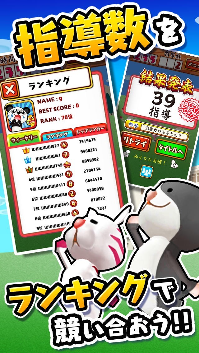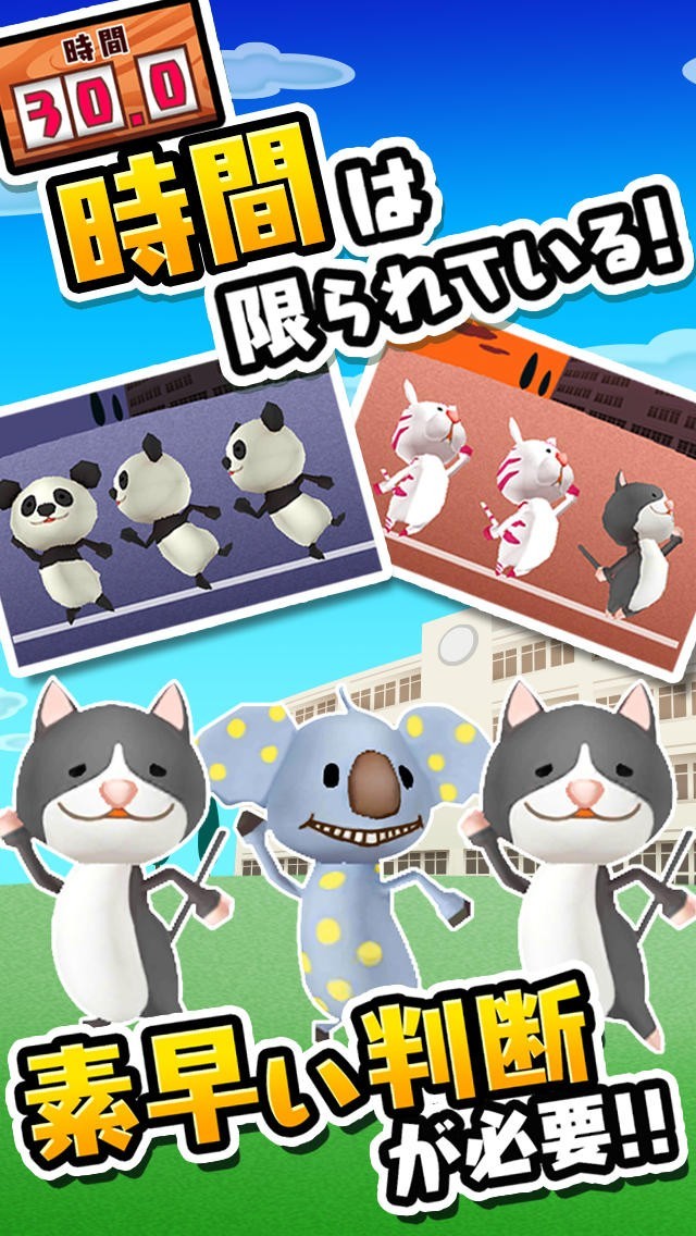 3つの中からパッと1つの間違いを探す、「おまえは帰れ!」は、表情が豊かでユーモア溢れるアニマル達が3匹で1グループになり、次から次へとやって来ます。 その中から1匹だけが違うアニマルなので、一瞬で見つけ出しその場ですぐタップ!時間制限があるので定められた時間内でいくつ間違いをタップできるかをランキング形式で競い合うゲームです。10匹をクリアするたび、ボーナスとしてタイム加算があります。アニマル達の種類は幅広くとてもユニークでパンダやコアラをはじめ、ネコ、牛、ライオンなどが現れ眺めているだけでも楽しめます。