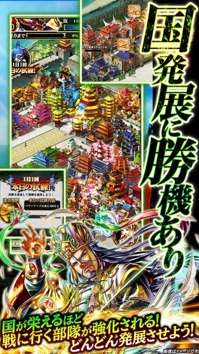 アプリ「軍勢RPG 蒼の三国志」では、中国統一までの戦乱を描く物語「三国志」をモチーフにした、リアルタイムストラテジーが魅力のRPGを楽しむことができます。カンタンな操作で進軍して敵を攻撃できるバトルゲームと、自国の軍備や施設を充実させて国力を高める箱庭シミュレーションゲームの両方の要素があり、じっくりやりこみたくなる魅力が満載です。