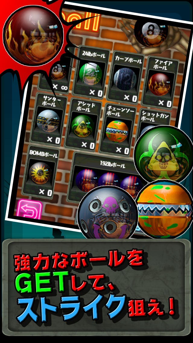 プレイヤーは全部で10種類のボールを選択することができます。重さやカーブのかかり具合が違うだけでなく、中にもスペシャルパワーを持っているボールも。特殊ボールを上手く使って、華麗なストライクを決めましょう。