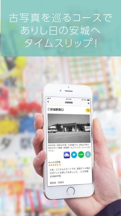 ARモードでは、現在の街並みに、過去の安城市の写真を表示し、見比べることもできます。