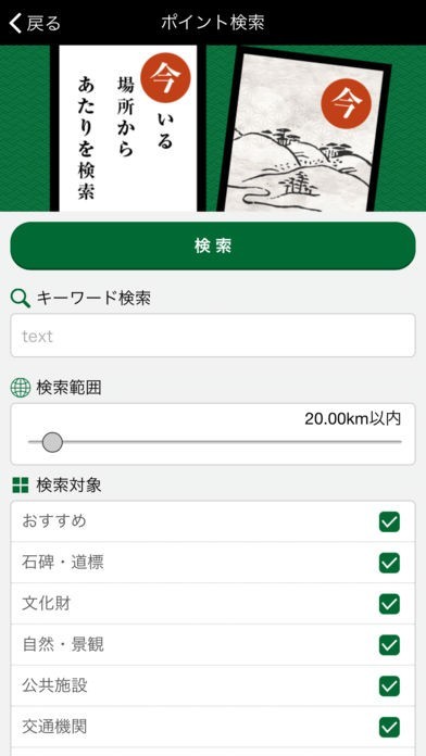 「ナビ」機能では、今いる場所から文化遺産や観光スポットなどの情報を知ることができます。また、今いる場所から目的地までの経路を案内します。