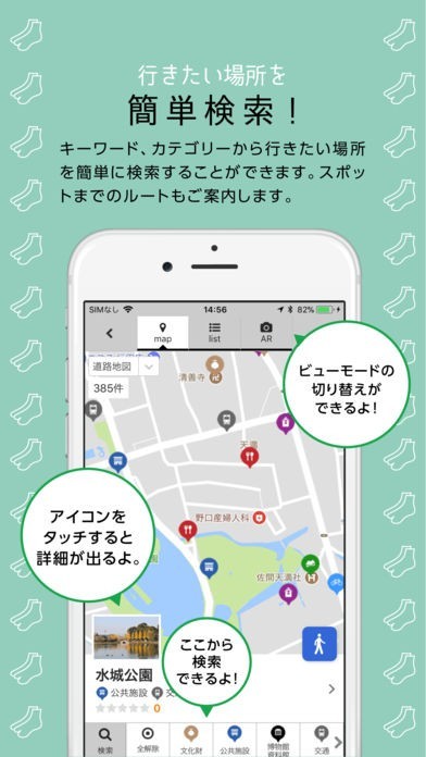テーマごとに紹介する「コース」機能、目的のスポットまで案内する「ナビ」機能があり、オフラインマップも使えるので、ネット環境がなくても地図を閲覧することができます。