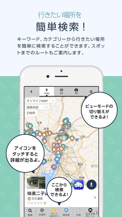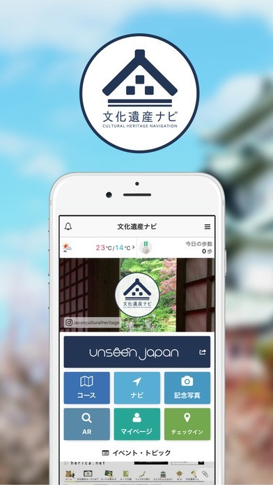 App Storeより引用文化遺産ナビは、周辺地域の観光スポットなどの情報を知ることができるナビゲーションアプリです。まだ見ぬ日本(Unseen Japan)の、あっと驚くような、文化遺産のおすすめポイントや穴場スポットをご紹介します。文化遺産を効率的に楽しく巡れるコースやスポットは現在、拡大中です!