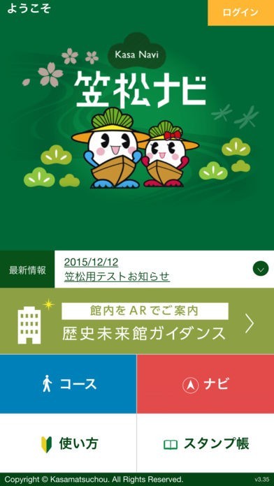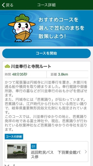 おすすめの名所をコースで巡る「コース案内」機能と、マップやリスト一覧で、目的のポイントまでご案内する「ナビ」機能があります。また、笠松町歴史未来館では展示解説ナレーションなどを聞くことができます。