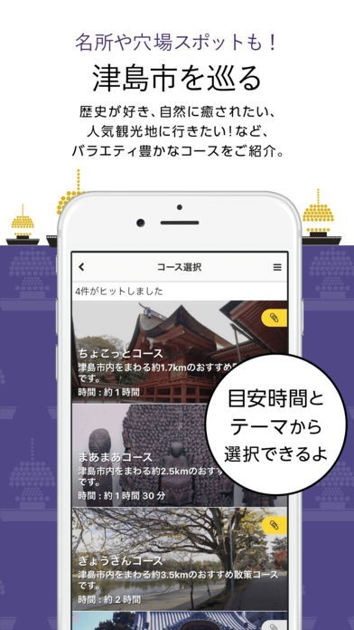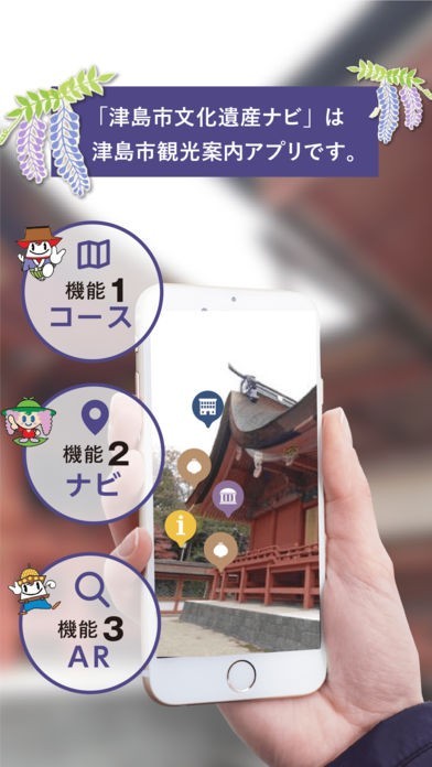 App Storeより引用愛知県津島市には、多くの文化遺産が残っています。このアプリケーションでは、テーマごとに観光スポットや文化遺産を巡るための探訪ルートを紹介する「コース」機能と、マップやリスト一覧で、目的のポイントまでご案内する「ナビ」機能があります。