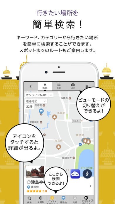 「ナビ」機能では、今いる場所から、文化遺産や観光スポットなどの情報を知ることができます。また、今いる場所から、目的地までの経路を案内します。