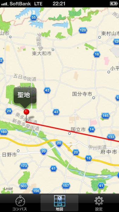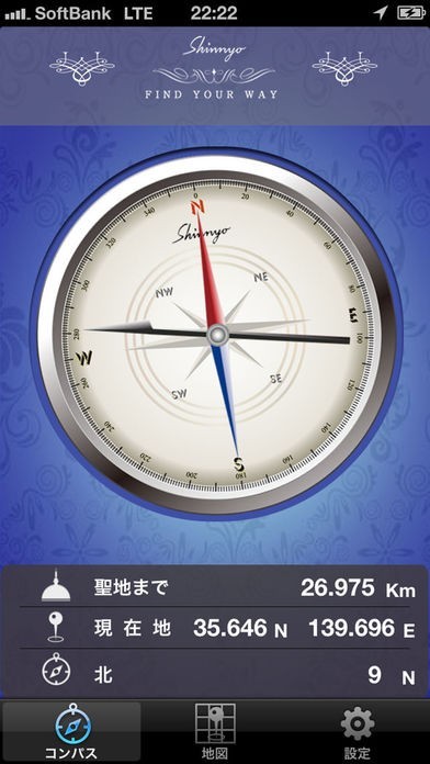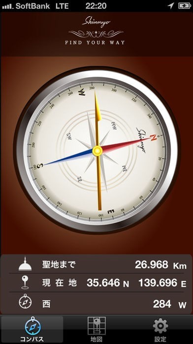 App Storeより引用聖地コンパスアプリです。気になるあの場所の方角、現在地からの距離が分かります。また、現在地とご指定の位置関係を知ることができます。