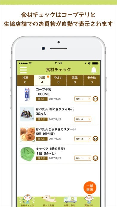 コープデリの宅配で注文した商品リストを自動的に冷蔵庫チェッカーに保存して、管理してくれる手軽な食材管理アプリです。賞味期限や個数を管理してくれるので食材を無駄にしたり、買い忘れを防ぐことができます。
