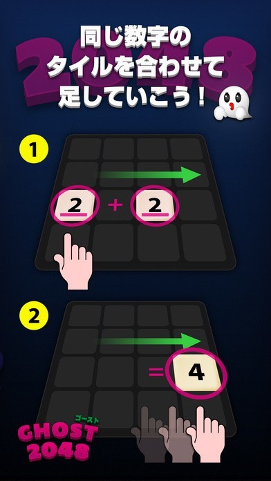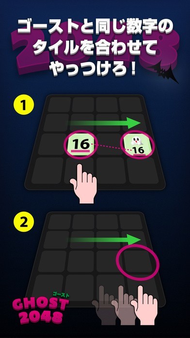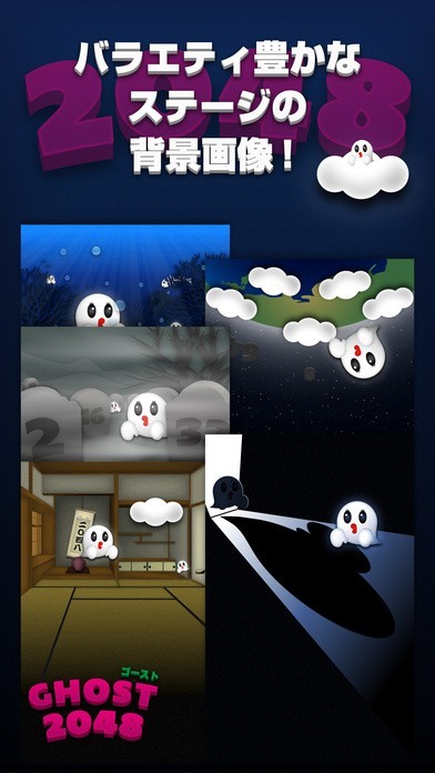 「Ghost2048」は、数字合わせでゴーストを退治する爽快パズルゲームです。 ステージに並べられたパネルには数字を表示。同じ数字が描かれたパネルを指先で重ねれば、パネル同士を合体させることができます。 ゴーストが出現したパネルにも、同じ数字を重ねるのがクリアへのポイント。 数字を合わせるだけの簡単操作ながら、奥深いゲーム性が楽しめるようになっています。 ステージごとに難易度がアップし、背景も次々変化。 和室や温泉、草原といった美麗な背景の中でゲームを満喫できます。