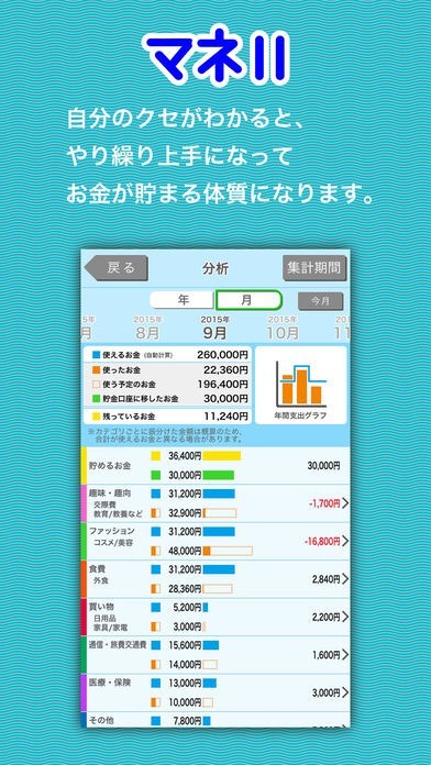 家計簿とカレンダーを組み合わせることで収支を効果的に分析できるようになっています。分析結果はグラフで表示できるので、自分のお金の使い方のクセを把握しやすく、今後に活かせます。