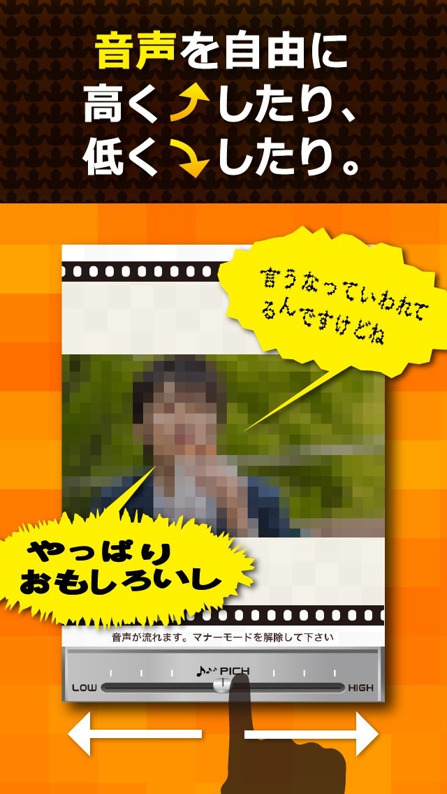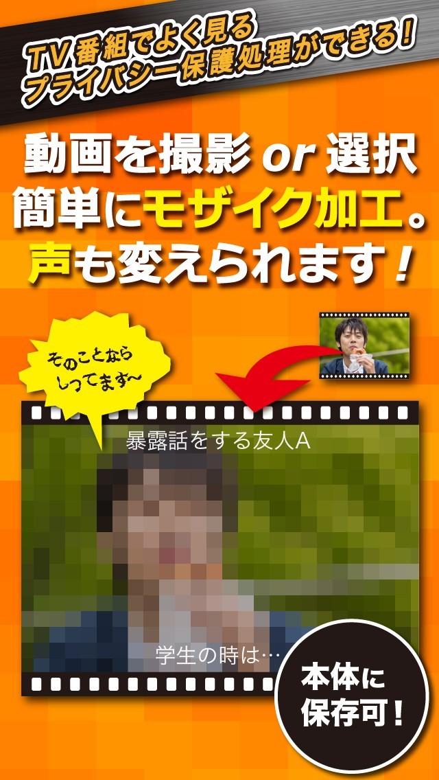 手軽な操作で動画にモザイク加工などを行い、最大1分の匿名インタビュー風映像を作成できるカメラアプリです。 編集用のスライドバーを搭載し、モザイクのブロックサイズが自由に変更できる他、音声のピッチも変更可能! さらにテロップ機能を使って画面の上下それぞれにコメントやセリフを入れられるようになっています。 シーンにぴったりなテロップを入れることで、より面白い動画に仕上げることができるでしょう。 友達同士で遊びながら作るジョーク用のビデオクリップにも最適です!