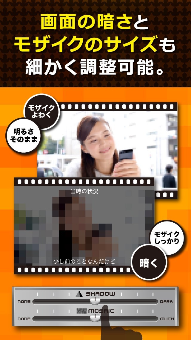 本アプリは、既に撮り終えた動画だけではなく、撮影中にもモザイク加工を施すことができます。また、モザイクの強さもスライドバー1つで選択可能仲をため、簡単に動画を編集できます。