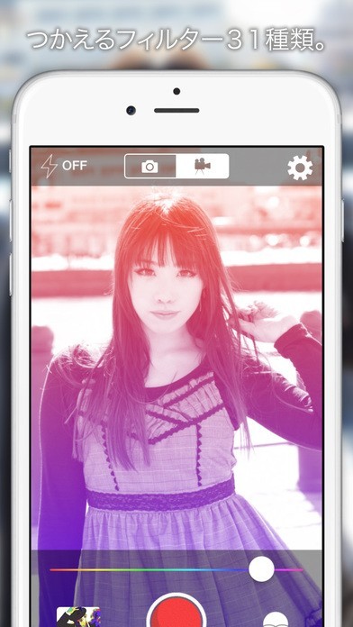 「FILTIST-面白フィルター盛りだくさんの動画撮影アプリ」はエフェクトが全31種類!美肌モードや高画質モードはもちろん、8ミリビデオ風レトロフィルターや万華鏡モードなどの個性的なフィルターがこれひとつで撮影可能です。 撮影サイズは正方形2種類とSD、HD、フルHDの5種類で、データはカメラロールに保存できるのでSNS用にも最適です。 使い方はカンタン。フィルターを選んで撮影するだけ!もちろん撮ったあとに効果の調整も可能です。