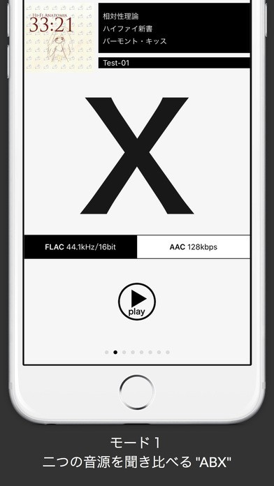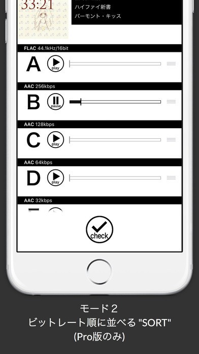 このアプリを使うことによって、スマートフォンでハイレゾ音源を聴くことが可能です。音声をそれぞれ聴き比べしたりといった使い方もできます。 ジャンルは特に指定はなくなんでも取り扱っておりますが、音質の良いものがいいでしょう。 よって、全くの未知の体験をすることもできますし、itunesでの最適な設定による変換を見つけ出し、容量が少ない割に高音質なものを見つけ出すことができます。 「ABXモード」では、ふたつの音源を左側と右側に用意されていてアプリ下部の「PLAY」ボタンを押すことによって、再生することができます。 また、有料モードの「PRO」を使うことによって、それぞれのフォーマットごとA、B、C、Dの中からビットレート順に「SORT」機能を使えるようになったり、フォーマットを伏せた状態で先入観にとらわれずに聴き分けることによって、自分に合ったフォーマットなどを発見するのに使うことができたり、広告を削除することもできたり、非圧縮PCM(44.1kHz)との比較まで行えるようになることから、購入するか検討する価値はあります。