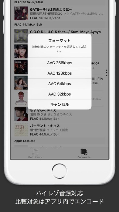 スマートフォンに保存してある音楽をAACフォーマットにエンコードして聞き比べをすることができるようになっているので、フォーマットによる違いを体感することができます。