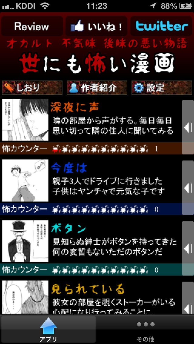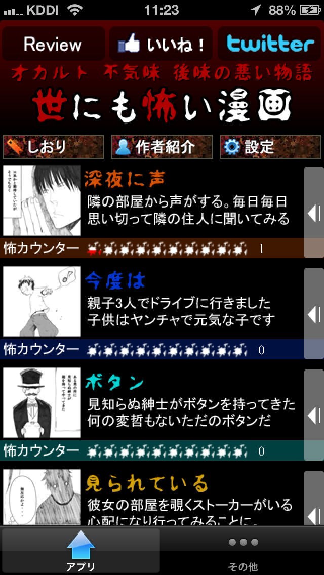 「世にも怖い漫画」では怖い話をマンガで楽しめるようにしてくれますし、すべて無料です。 このアプリではマンガはダウンロードされていることから、地下鉄などでも場所を選ばす読むことができます。 また、怖カウンターというものが用意されているので、怖すぎるものは見たくないというような人でも安心です。 さらに、しおり機能があって途中から読み直すこともできますし、読み終わって怖かった場合には投票することもできます。 他にもツイッターやインスタグラムにボタン一つで共有することもできます。