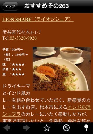 ブログサイト「お気に入りのカレー屋さん700」をiPhoneアプリ化。ブログで紹介されているおすすめカレー約700店舗をアプリ内にすべて収録しています。軽快な当社マップ・シリーズの使い勝手はそのままに、ブログで紹介されている店舗をマップから素早く検索できます。もちろん、各店舗に関するブログの紹介記事も読めます。