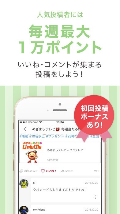 自分が知っているおトク情報があれば投稿することでポイントがもらえます。いいねやコメントが多かった人気の投稿者には毎週最大で1万ポイントがもらえる特典も!自分の知ってる情報を有効に活用しましょう。