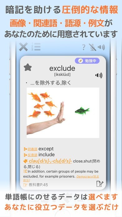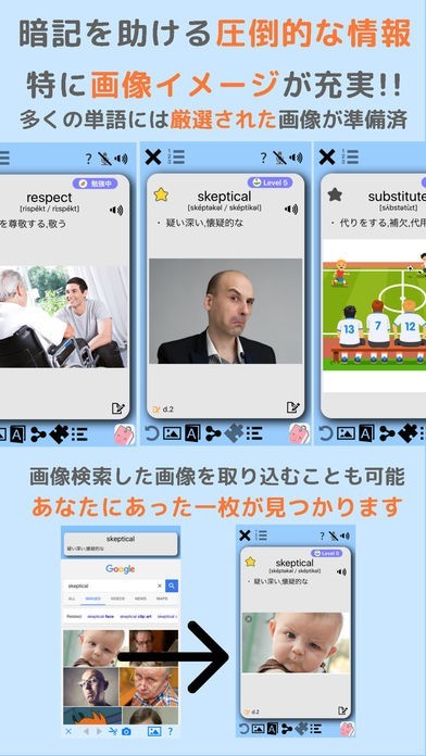 「英単語専用単語帳アプリ」では、ただ単に単語を学習するのではなくて、画像や関連語や語源や例文などといったものも付属しているので、関連付けて多くのことを学ぶことが出来るようにしてくれます。 特に画像では関連付けで覚えるための興味深くて特徴的なものを選んでおり記憶に大きく役立ちます。 加えて発音を音声ボタンで聴くといったことも出来ることから、リスニングの学習も同時に行うことができます。 さらには、何日かおきに何度も復習することが出来るシステムがあるので、記憶をしっかりと定着するまでお手伝いしてくれて、完全に記憶するまで実行できます。