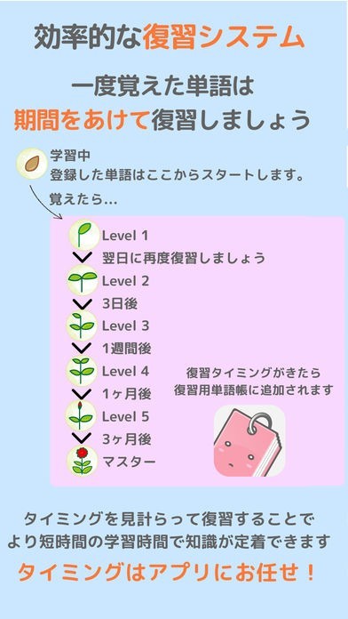 何日かおきに何度も復習することが出来るシステムで復習が可能!